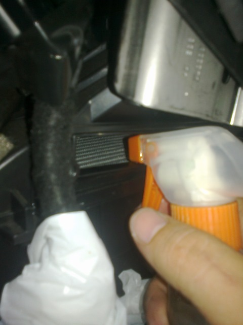 Затем, включив рециркуляцию воздуха в салоне, я в воздухозаборник, расположенный в салоне, так же начал распылять раствор, при этом на полу должен лежать резиновый коврик, так как будет стекать раствор обратно. После этого я нанес раствор на радиатор печки и радиатор кондиционера.