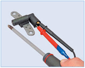 Для дальнейшей проверки датчика снимаем его (см. «Снятие датчика положения коленчатого вала») и подсоединяем к выводам датчика щупы тестера.