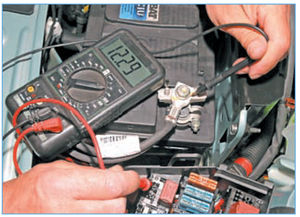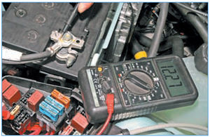 …прибор должен зафиксировать напряжение, приблизительно равное напряжению аккумуляторной батареи.