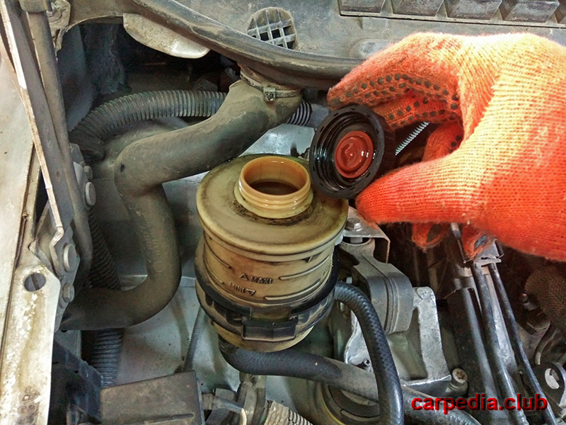 5. Плотно закройте крышку бачка гидроусилителя руля, повернув ее за часовой стрелкой. Пролитую жидкость устраните чистой ветошью.