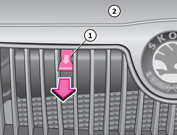 2. Потяните на себя рычаг 1 предохранительного крючка, расположенного чуть левее середины передней части капота. Другой рукой поднимите капот 2.