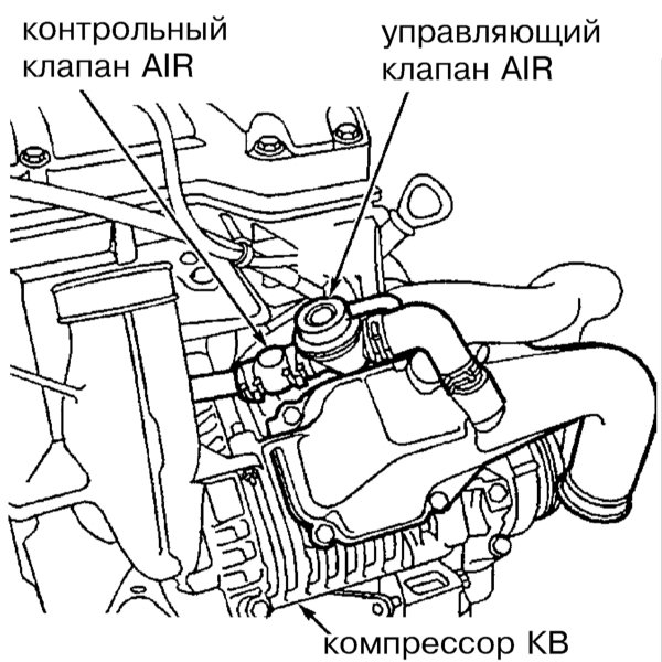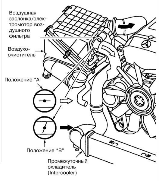 При полной нагрузке заслонка находится в положении В - воздух подается в компрессор. В положении А - воздух идёт в обход компрессора. В интеркулер воздух подается в обоих случаях. Управление заслонкой от электронного блока управления.
