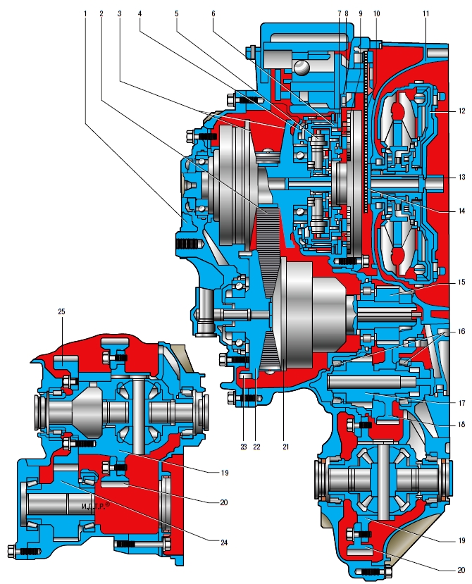 Рис. 6.6. Бесступенчатый вариатор RE0F10A: 1 – боковая крышка вариатора; 2 – стальной гибкий ремень; 3 – подвижные полушкивы первичного вала; 4 – кожух планетарной передачи; 5 – центральная шестерня планетарной передачи; 6 – фрикцион; 7 – фрикционный тормоз; 8 – насос рабочей жидкости вариатора; 9 – цепь привода насоса; 10 – зубчатый барабан привода насоса; 11 – кожух гидротрансформатора; 12 – гидротрансформатор; 13 – первичный вал; 14 – зубчатый барабан цепи привода насоса; 15 – ведущая шестерня вторичного вала; 16 – подшипники; 17 – шестерня редукционной передачи; 18 – промежуточная шестерня; 19 – корпус дифференциала; 20 – шестерня главной передачи; 21 – подвижные полушкивы вторичного вала; 22 – шестерня стояночного положения; 23 – сателлитная шестерня планетарной передачи; 24 – шестерня привода выходного вала раздаточной коробки; 25 – шестерня отбора мощности для привода задних колес.