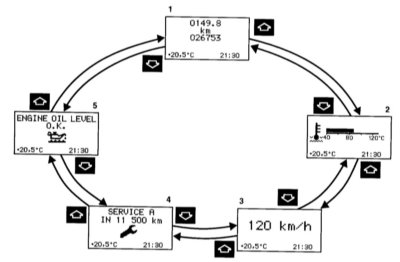 Индикации на универсальном дисплее, в зависимости от установки, производятся на немецком, английском, французском, итальянском или испанском языках. Переключение на другой язык - см. меню «INSTRUMENT CLUSTER» (ПРИБОРНАЯ ДОСКА) системы «Индивидуальная установка» меню установки «ТЕХТ» (ЯЗЫК ТЕКСТА). |