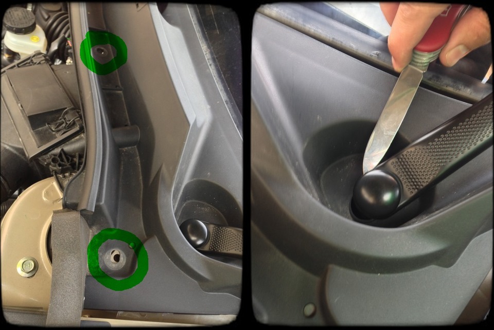 Дальше, для того что бы можно было подлезть под поводок съемником, я ослабил пластиковую накладку, выщелкнув все пистоны (дело 1-й минуты). Обмотав лапки съемника тряпкой (что бы не повредить пластик вокруг) принялся медленно стаскивать поводок дворника и через минуту мне это удалось.