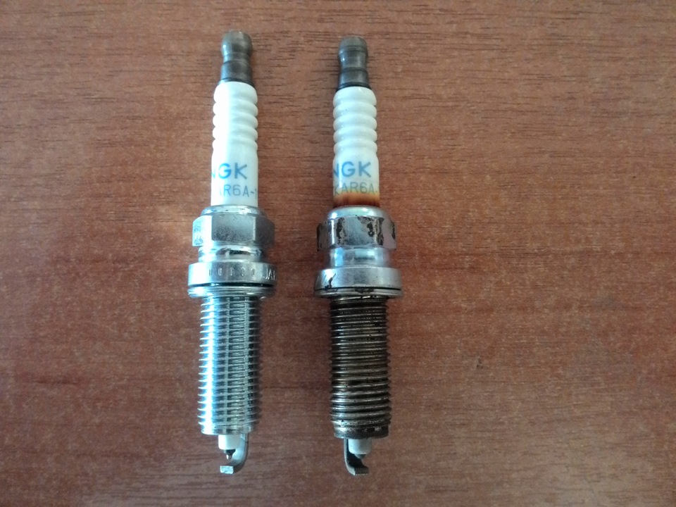 Но суть не в этом. При замене решил заодно поменять прокладку коллектора. Когда выкрутили старые свечи — был немного удивлен: внутренний электрод сточился по сравнению с новыми свечами.