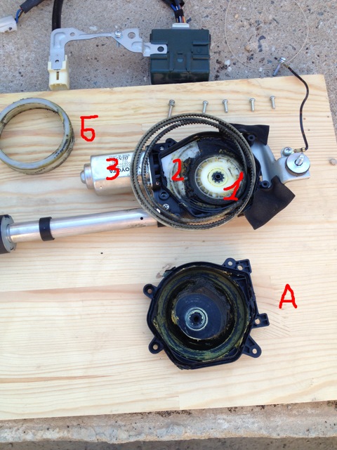 9. Снимаем крышку механического блока (А), аккуратно вынимаем пластиковый защитный стакан (Б), вынимаем верхнюю шестерню (1), вынимаем блок шестерней (2), снимаем моторчик, предварительно открутив 2 болта (3) (снимать мотор необязательно, только если чистить штифт), вынимаем нижнюю шестерню (4).