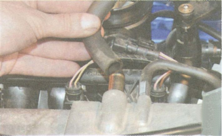 2. Отсоединяем от патрубка крышки головки блока цилиндров шланг большой ветви системы вентиляции картера и снимаем его.