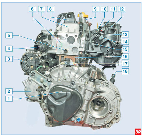 Двигатель с коробкой передач и сцеплением образуют силовой агрегат – единый блок, закрепленный в моторном отсеке на трех эластичных резинометаллических опорах. Правая опора крепится к кронштейну на верхней крышке привода газораспределительного механизма, а левая и задняя – к картеру коробки передач. Спереди на двигателе (по направлению движения автомобиля) расположены: выпускной коллектор, масляный фильтр, датчик сигнализатора недостаточного давления масла, подводящая труба насоса охлаждающей жидкости, свечи зажигания, генератор, насос гидроусилителя руля, компрессор кондиционера.