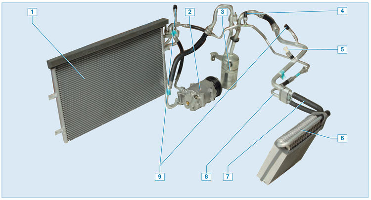 Находящийся в газообразном состоянии хладагент под низким давлением поступает из испарителя в ресивер. Ресивер одновременно выполняет несколько функций: в качестве фильтра очищает хладагент от попавших в него примесей; в качестве осушителя поглощает влагу, конденсирующуюся внутри системы кондиционирования, а также служит резервуаром для хладагента. Из ресивера хладагент поступает в компрессор, повышающий давление хладагента.