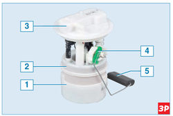 Насос электрический, погружной, роторный. Он включается по команде ЭБУ при включении зажигания и подает топливо в магистраль под давлением (около 6,0 бар), превышающим рабочее давление в рампе. Топливо, проходя через насос, во время его работы смазывает и охлаждает насос. Поэтому запрещается включать насос даже на короткое время, если в баке нет топлива.
