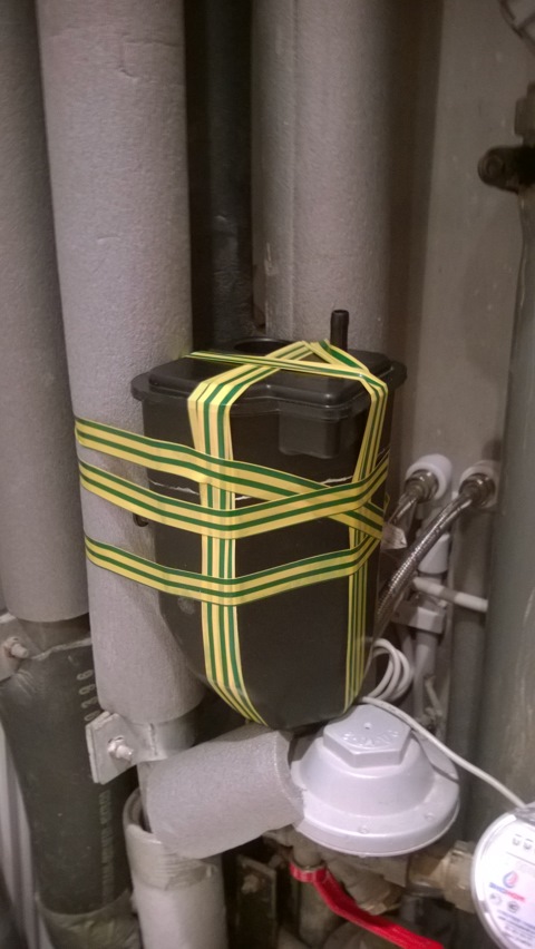 После промывки фильтры сушим (были очень грязные). Также подсушиваем, по возможности, уголь, моем сеточку, которая находится в верхней части адсорбера под отверстием, в которое пытался продуть адсорбер. Собирал так: в нижнюю часть засыпал уголь сколько влезло. В верхнюю часть адсорбера вставил поролон (держится хорошо). Собственно намазал клеем, состыковал и скрутил изолентой. Для скорейшего высыхания и доп.просушки угля прикрутил адсорбер к трубе стояка подачи горячей воды.