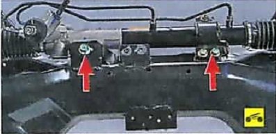 6. Резко поворачивая рулевое колесо в обоих направлениях (это должен делать помощник), проверьте визуально и на слух правое и левое крепления рулевого механизма. Перемещение механизма и стуки не допускаются (для наглядности рулевой механизм снят с автомобиля).