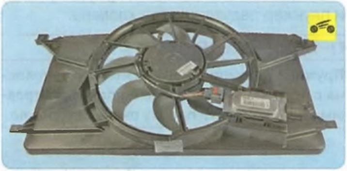 Электровентилятор системы охлаждения (с пластмассовой восьмилопастной крыльчаткой) служит для дополнительного обдува радиатора, включается и выключается по сигналу электронного блока управления двигателем. Причем в зависимости от напряженности теплового режима и алгоритма работы кондиционера электровентилятор может вращаться с малой и большой скоростью. Изменение скоростного режима вентилятора обеспечивается блоком управления двигателем путем подключения дополнительного сопротивления. Электровентилятор в сборе с кожухом закреплен на радиаторе системы охлаждения. Отводящий патрубок водяной рубашки служит для распределения потоков охлаждающей жидкости в зависимости от режимов работы системы охлаждения. В корпус патрубка ввернут датчик температуры охлаждающей жидкости, по информации которого электронный блок системы управления двигателем управляет тепловым режимом двигателя.