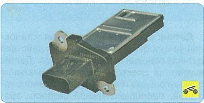 Комбинированный датчик массового расхода и температуры поступающего воздуха. Принцип работы датчика массового расхода воздуха основан на поддержании постоянной температуры резисторов (чем выше скорость потока воздуха, тем больший ток необходим для поддержания температуры резистора). Принцип работы датчика температуры поступающего воздуха аналогичен принципу работы датчика температуры охлаждающей жидкости. В зависимости от показаний этих датчиков ЭБУ корректирует количество топлива, впрыскиваемого в цилиндр, для получения оптимальной рабочей смеси.