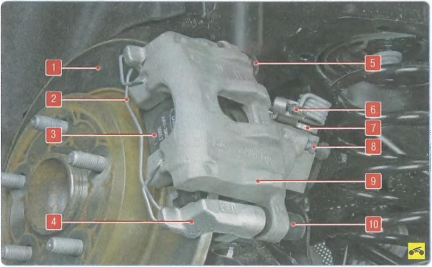 Рис. 9.2. Тормозной механизм заднего колеса: 1 - тормозной диск; 2 - пружинный фиксатор наружной колодки; 3 - наружная тормозная колодка; 4 - направляющая колодок; 5,10 - направляющий палец подвижной скобы (находится внутри защитной втулки); б - наконечник троса привода стояночного тормоза; 7 - поворотный рычаг стояночного тормоза; 8 - клапан выпуска воздуха; 9 - подвижная скоба.