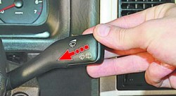 Переключателем в верхней части рычага регулируется интервал срабатывания щеток стеклоочистителя в прерывистом режиме работы: крайнее левое положение — минимальный интервал, крайнее правое — максимальный.