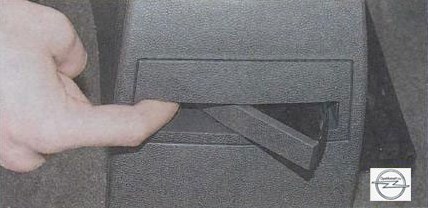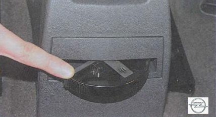 Задняя пепельница Опеля установлена в заднем торце облицовки тоннеля пола.
