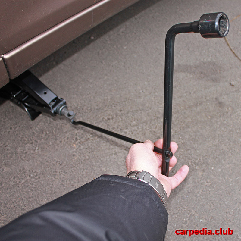 7. После того как установили домкрат, плавно без резких движений крутите его ручку по часовой стрелке, чтобы поднять автомобиль.