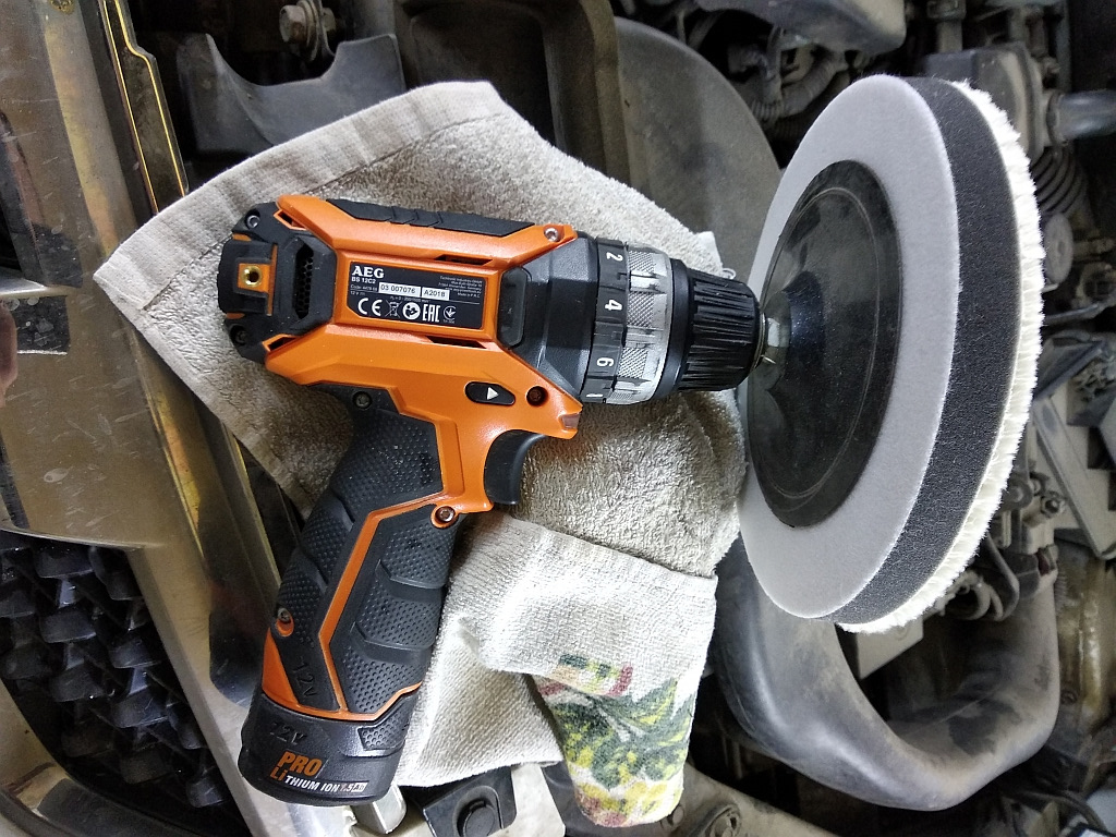 Второй вариант — дрель с полировальным кругом. Дрель должна быть с регулятором частоты вращения.