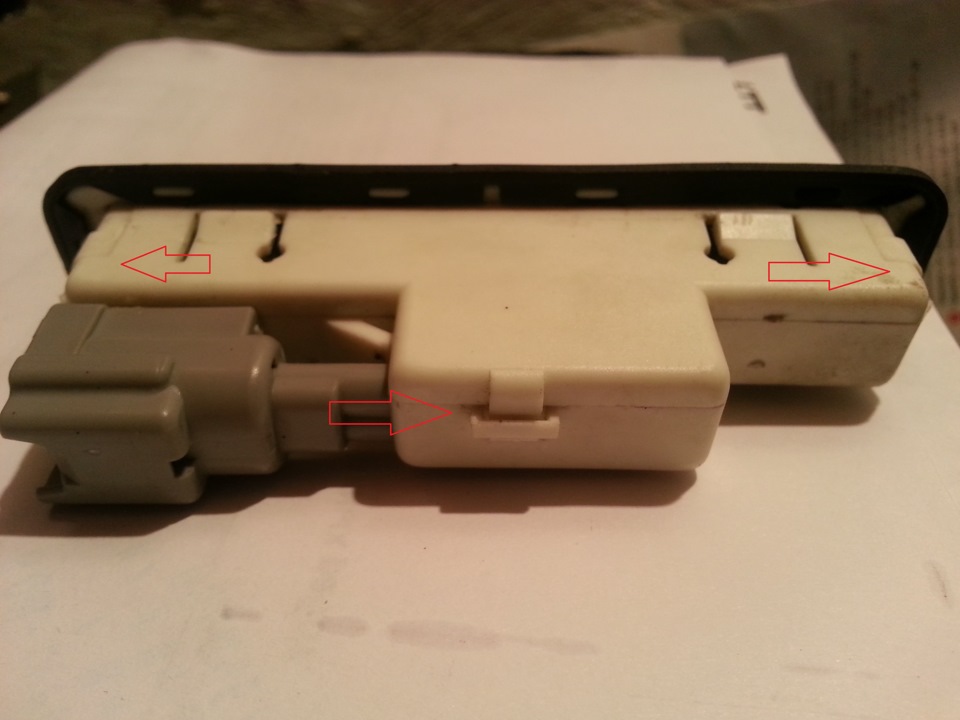 3. Аккуратно отжав три зажима, разбираем кнопку на две половины.Зажимы кнопки открытия багажника Nissan Primera
