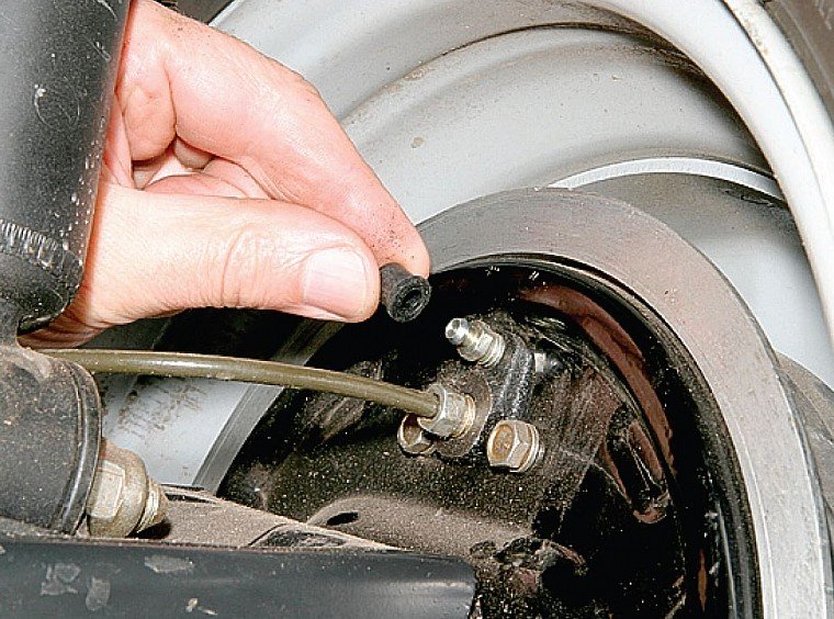 4. Очистите от грязи штуцер прокачки тормозного механизма правого заднего колеса ветошью и снимите с него защитный колпачок.