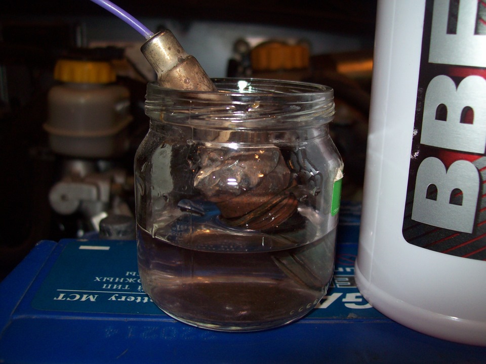 4. Налейте преобразователь ржавчины в банку и опустите рабочую часть кислородного датчика в жидкость на 20 минут.