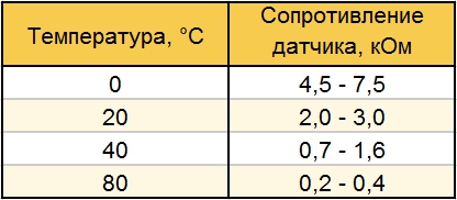 Контрольные значения сопротивлений датчика, температуры воздуха во впускном трубопроводе.