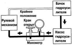 Рис. 5.10. Проверка давления рабочей жидкости при открытом кране манометра и повороте рулевого колеса в крайнее положение