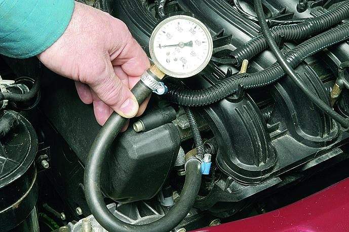 Давление в топливной рампе можно проверить обычным манометром (например, от шинного насоса).