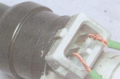 8. Включаем зажигание и, дождавшись прекращения работы топливного насоса, выключаем зажигание. Подсоединяем к выводам форсунки два провода длиной не менее 1 метра.