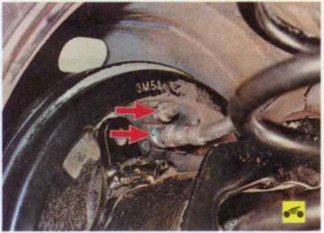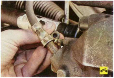 6. Осмотрите соединения шлангов с рабочими цилиндрами, снимите защитный колпачок и проверьте на отсутствие утечек клапаны для выпуска воздуха тормозных механизмов передних колес.