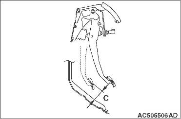 (4) Измерить высоту педали тормоза еще раз и проверить, соответствует ли она стандартному значению (А+В). Если высота педали тормоза не соответствует стандартному значению, измерить расстояние, обозначенное на рисунке буквой С (от края шпильки усилителя тормоза до центра отверстия толкателя), и проверить, соответствует ли оно стандартному значению (С).