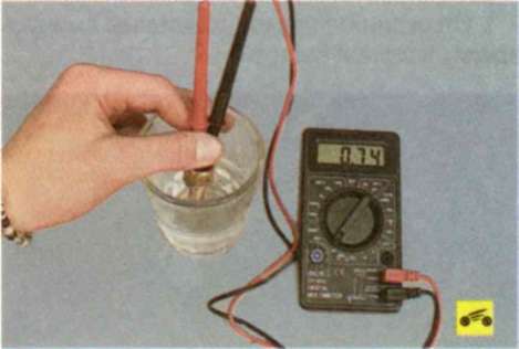 7. Для измерения сопротивления на выводах датчика Форд при различных температурных режимах, опустите датчик в горячую воду и проверьте изменение его сопротивления по мере остывания воды, контролируя температуру воды термометром.