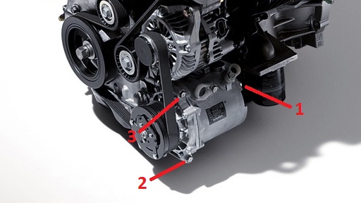 6. Ослабьте болты крепления компрессора кондиционера и электромагнитной муфты в сборе и снимите компрессор и муфту с кронштейна вместе с подсоединенными шлангами. Ниже приведена последовательность ослабления болтов крепления компрессора кондиционера с муфтой в сборе.