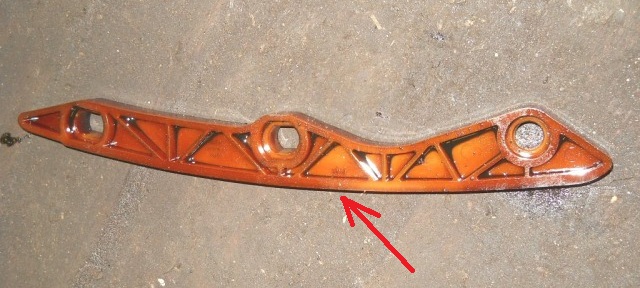 4. Проверьте успокоитель цепи на отсутствие трещин, отслоения или других дефектов на поверхности "А" (скользящий контакт с цепью привода ГРМ) и на поверхности "В", которая находится в контакте с натяжителем. Замените успокоитель цепи в случае необходимости.