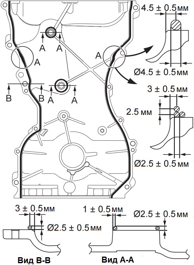 14. Нанесите герметик непрерывной полоской диаметром 2,5 ± 0,5 мм по фланцу крышки цепи привода ГРМ и диаметром 4,5 ± 0,5 мм или 2,5 ± 0,5 мм на фланец крышки цепи привода ГРМ в области "А".