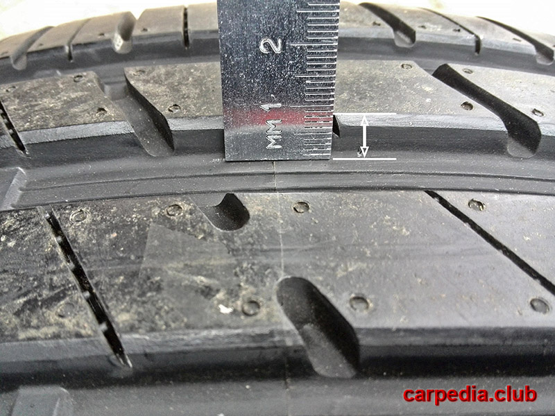 9. Если под рукой нет штангенциркуля, то глубину протектора можно проверить визуально по индикаторам износа шины в виде сплошных поперечных полос на протекторе.