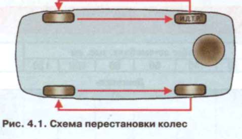 Для того чтобы шины изнашивались равномерно, через каждые 10 ООО км пробега переставляйте колеса в соответствии.