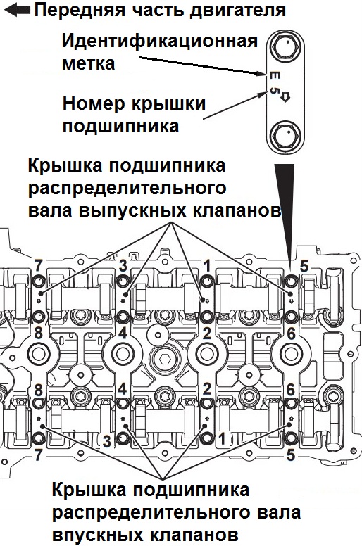 Поскольку крышки подшипников распределительных валов с каналом подачи масла и упорные крышки подшипников распределительных валов имеют одинаковую форму с другими крышками подшипников, то для корректной установки проверьте соответствие идентификационной метки и номера крышек с местом установки (идентификация стороны впускных и выпускных клапанов) и номером подшипника: