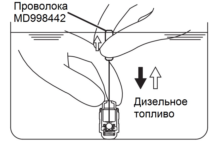 14. Поместите гидрокомпенсатор на дно третьей емкости вертикально, плунжером вверх и отожмите проволокой (MD998442) шарик его клапана.