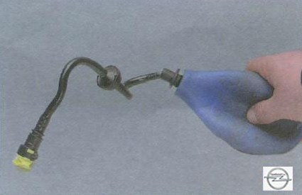 7. Проверьте работоспособность клапана, установленного в вакуумном шланге, для чего плотно вставьте носик резиновой груши в тот конец вакуумного шланга, которым шланг подсоединялся к вакуумному усилителю, и сожмите ее. Воздух из груши должен выйти через клапан.