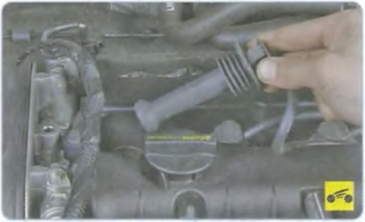 4. Если катушка зажигания исправна, проверьте наличие искры на свечах зажигания. Снимите провод высокого напряжения с любой свечи зажигания.