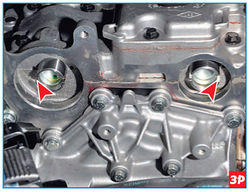 3. Регулируем натяжение ремня привода ГРМ (см. выше). Выворачиваем установочный палец из отверстия в блоке цилиндров и снимаем приспособление для фиксации распределительных валов. Проворачиваем коленчатый вал на два оборота по часовой стрелке до момента, пока пазы на торцах распределительных валов не займут нужного положения (см. выше). Проверяем фазы газораспределения и натяжение ремня. При необходимости повторяем операции по установке ремня привода ГРМ. Заворачиваем заглушку в отверстие блока цилиндров.