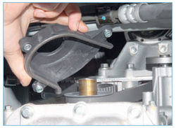 При этом отводим край верхней передней крышки привода ГРМ от крышки головки блока цилиндров и, удерживая крышку привода в таком положении, оцениваем состояние зубчатого ремня.
