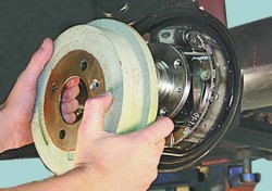 5. Для проверки степени износа тормозных колодок заднего тормозного механизма снимите заднее колесо и тормозной барабан (см. «Снятие и установка тормозного барабана»).