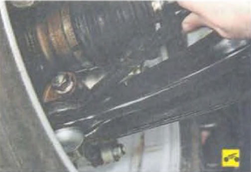 6. ...и задние сайлентблоки в местах крепления рычагов к подрамнику. Упираясь монтажной лопаткой в подрамник, попытайтесь покачать рычаг подвески. При наличии значительного люфта замените сайлентблоки или рычаг передней подвески в сборе.