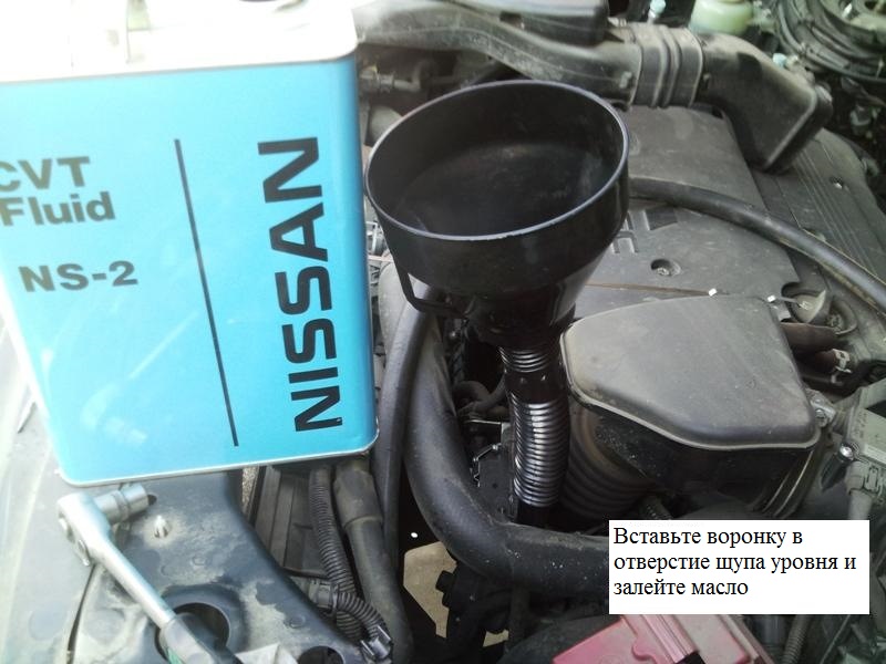 7. Залейте новую рабочую жидкость в вариатор через направляющую трубку щупа уровня рабочей жидкости (на фото жидкость NS-2, иногда пользователи используют его вместо оригинального).
