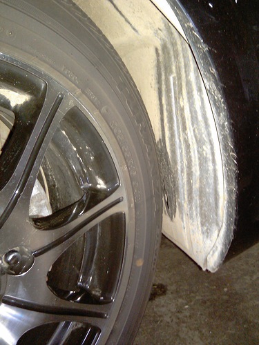 Колесо слишком выпирает в арку, поэтому на кочках резина прорезала подкрылок вот так: