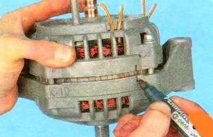 6. Отверткой отожмите пружинный фиксатор и одновременно другой отверткой выведите из фиксатора вывод статорной обмотки генератора. Проделайте такую операцию с шестью выводами.